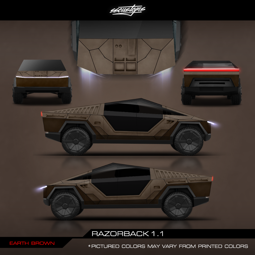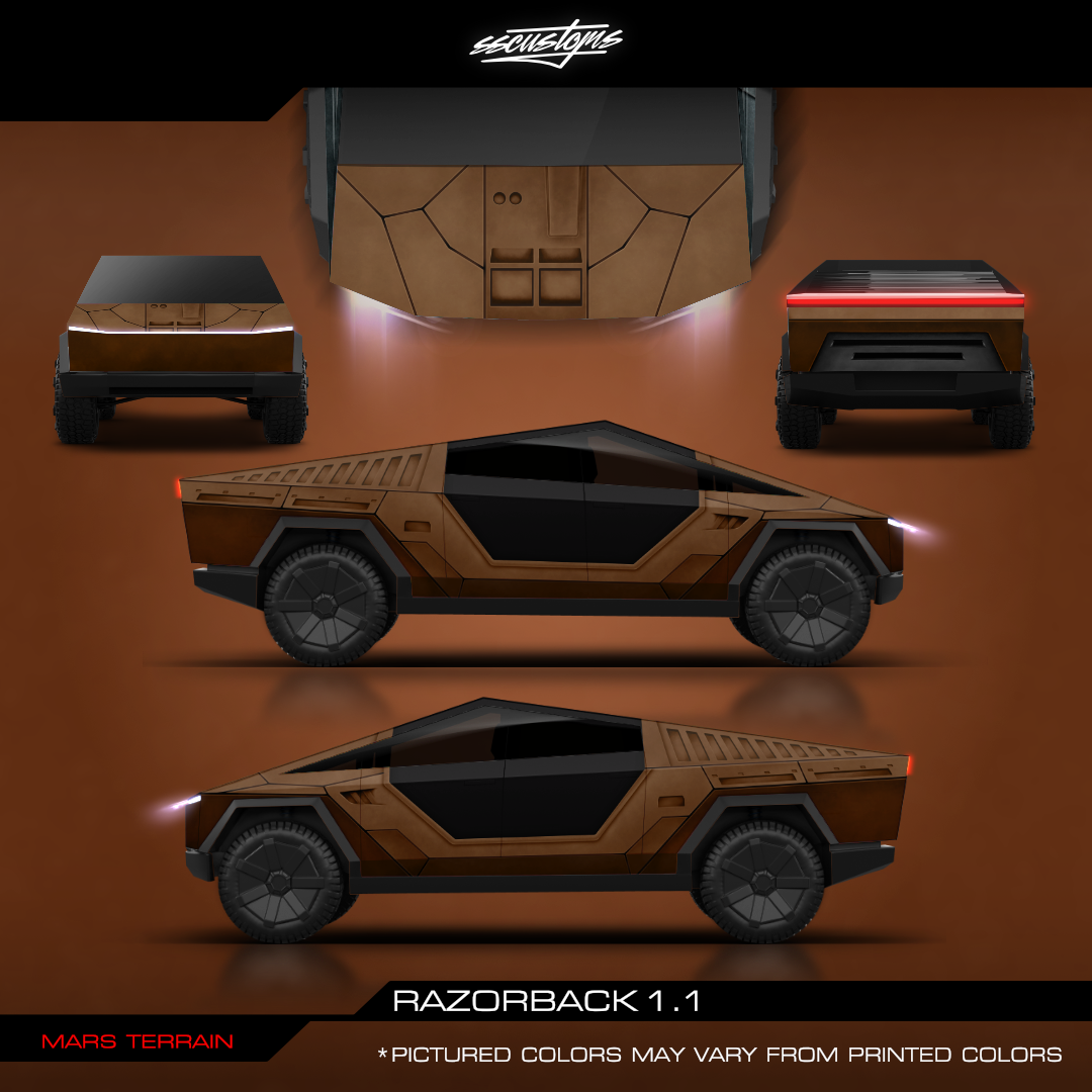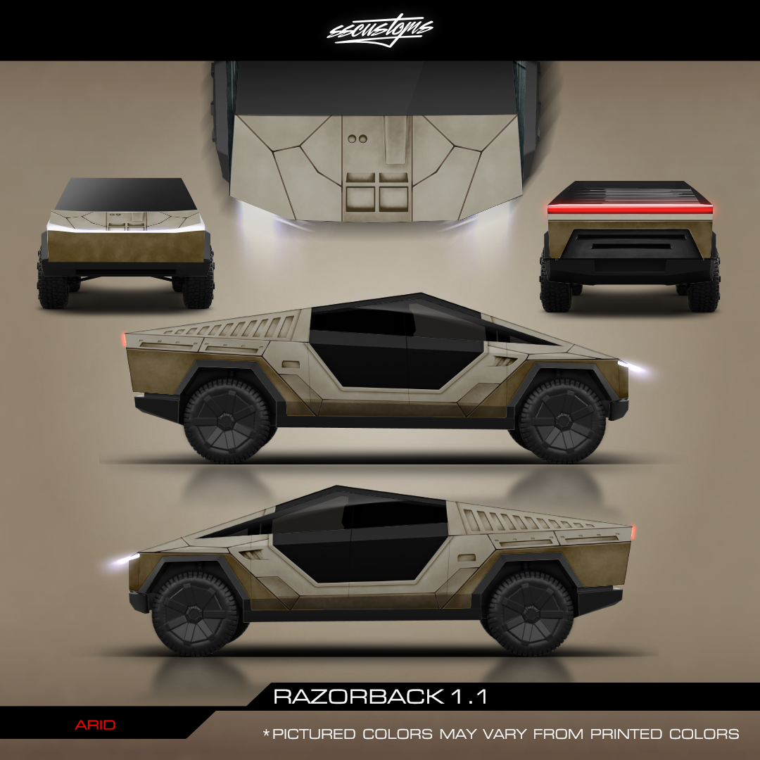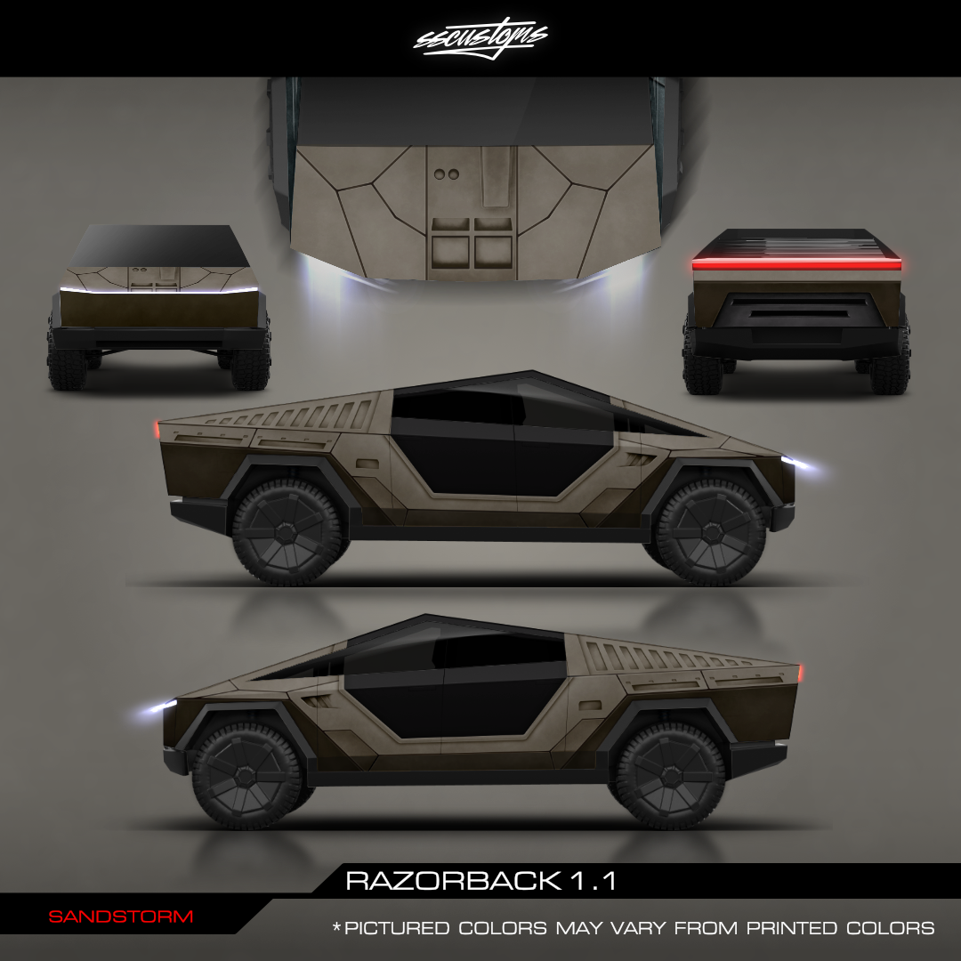 This is our own unique take on an off-world combat vehicle. This design took weeks to craft. The details showcase various vents and ports. Enhanced dimensional metal-esque panels with realistic fading. This is sure to be a show stopper. Couple this with Unplugged Performance Molle Racks and Roof Racks (Coming Soon to our CyberTruck Shop) for the perfect off-world combat look.
