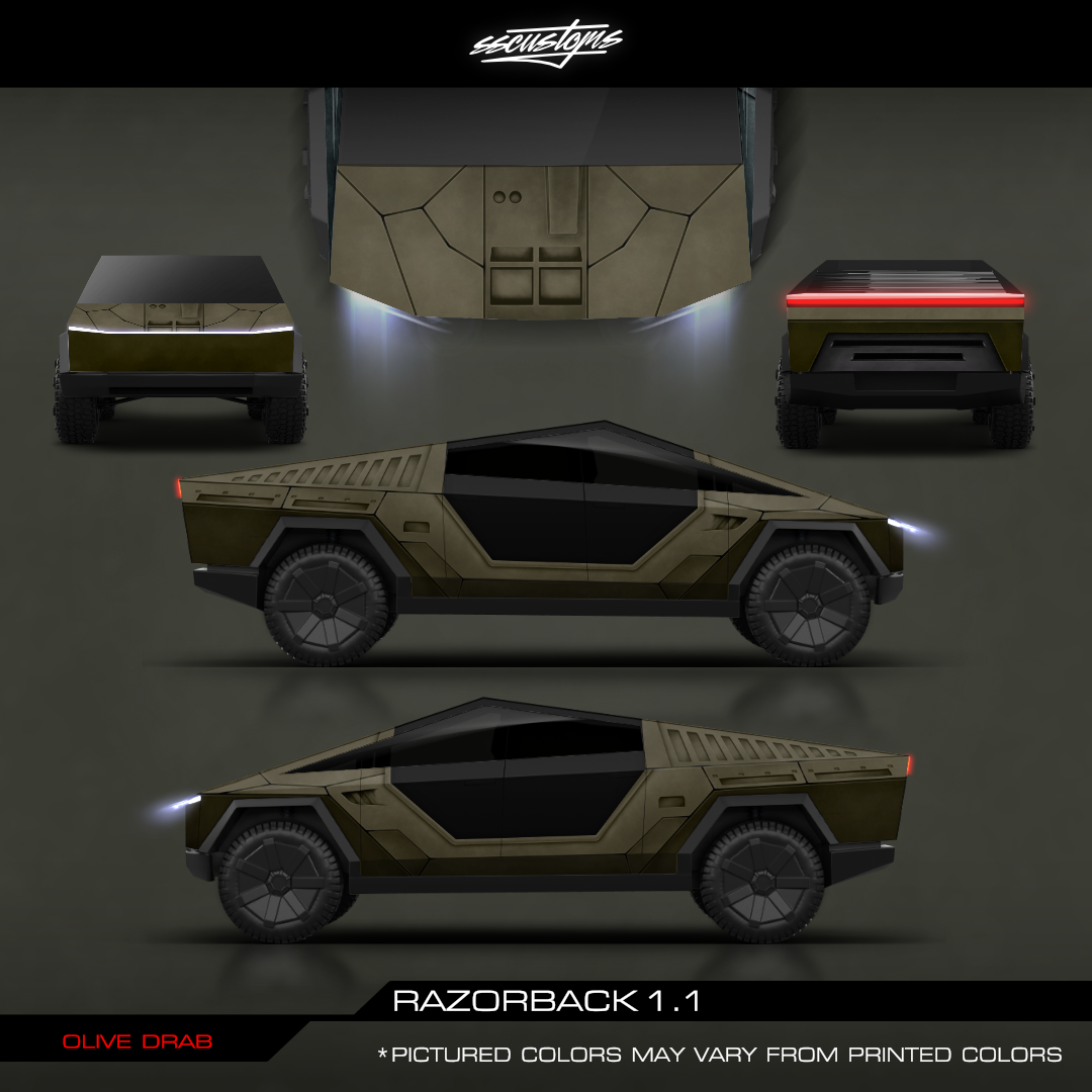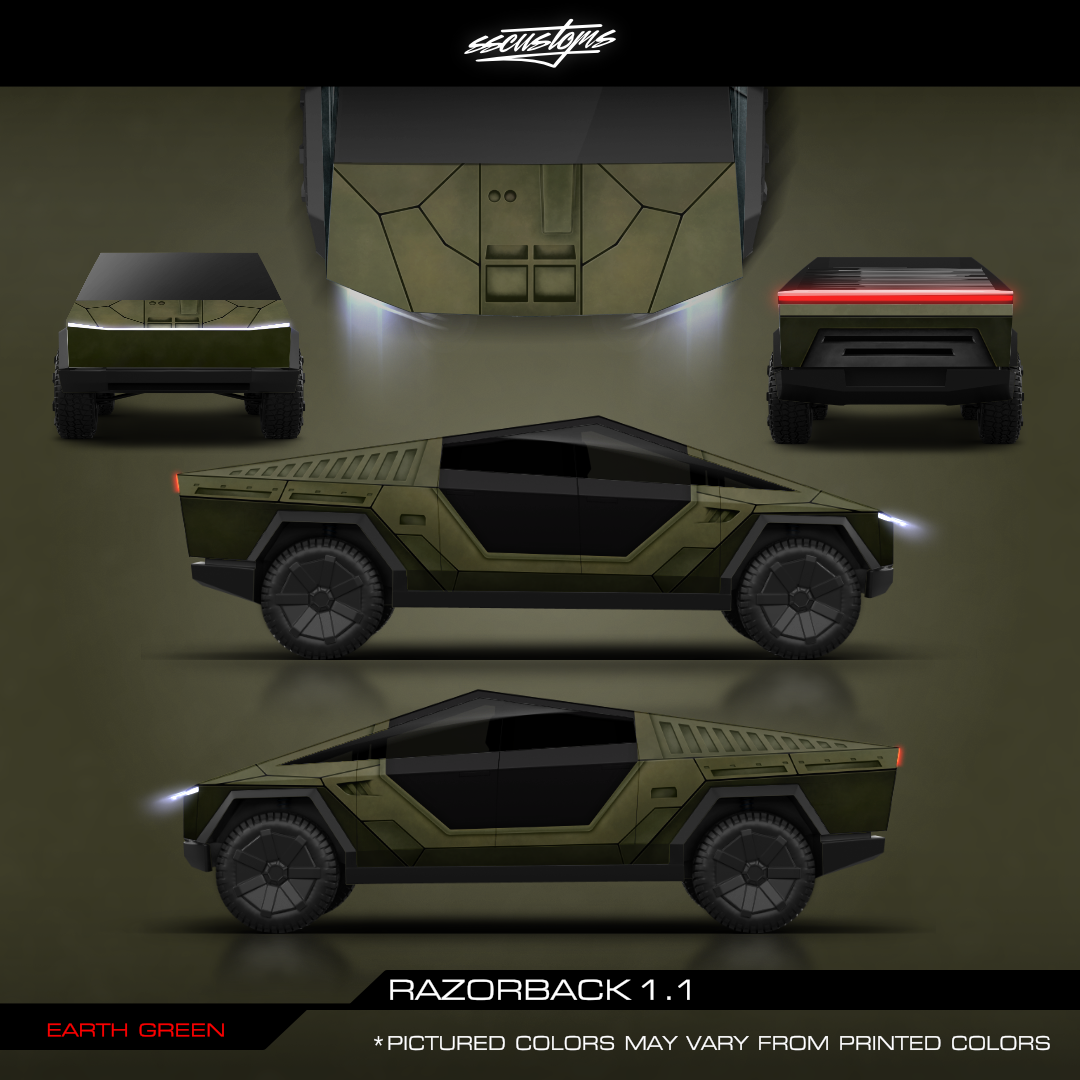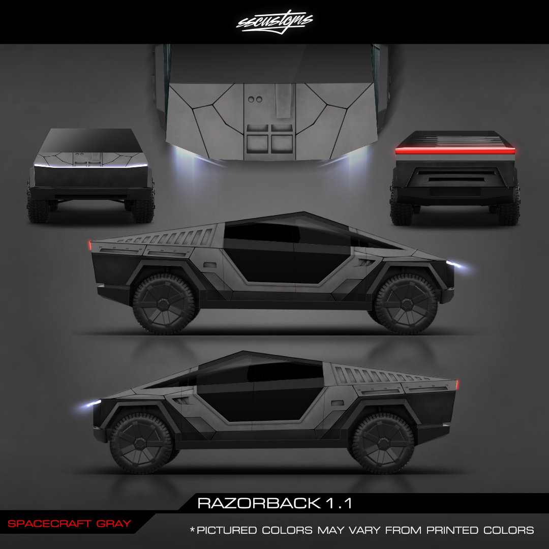 This is our own unique take on an off-world combat vehicle. This design took weeks to craft. The details showcase various vents and ports. Enhanced dimensional metal-esque panels with realistic fading. This is sure to be a show stopper. Couple this with Unplugged Performance Molle Racks and Roof Racks (Coming Soon to our CyberTruck Shop) for the perfect off-world combat look.