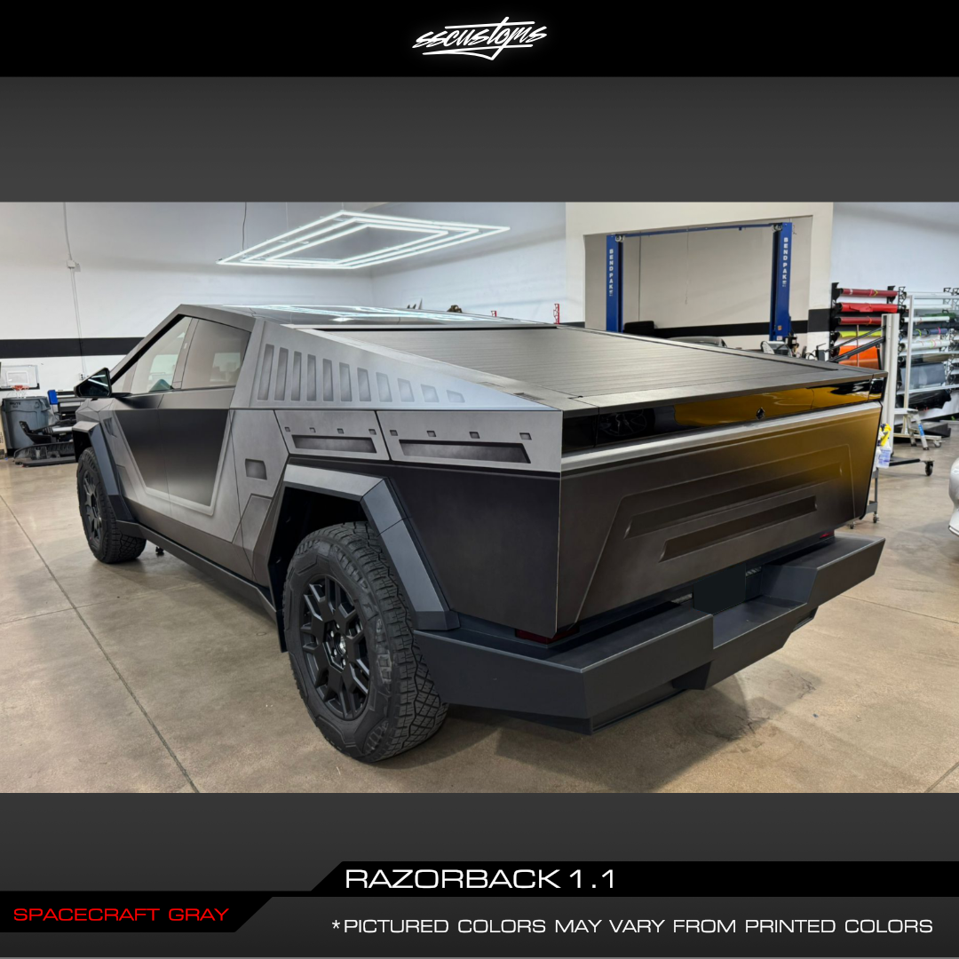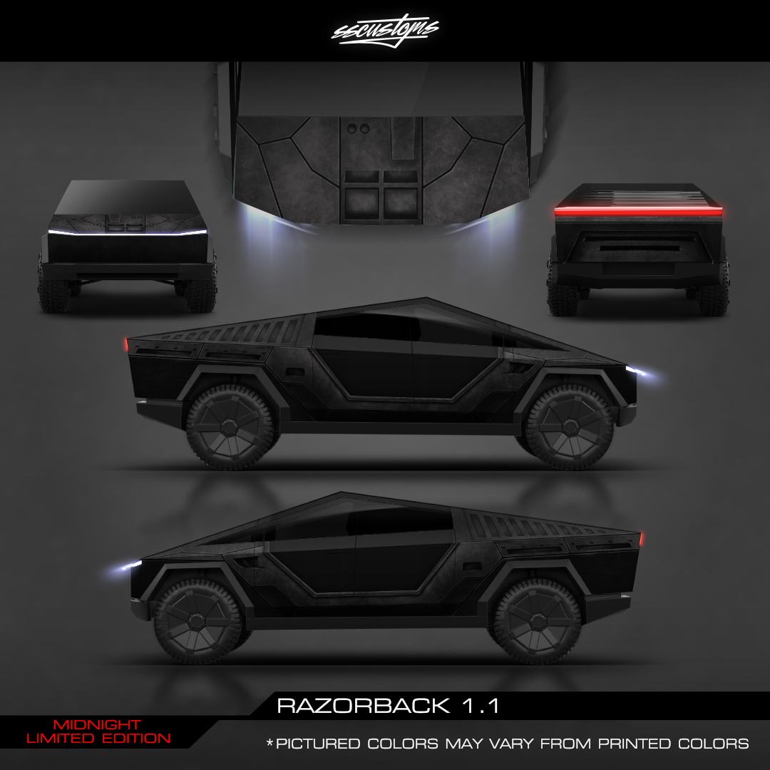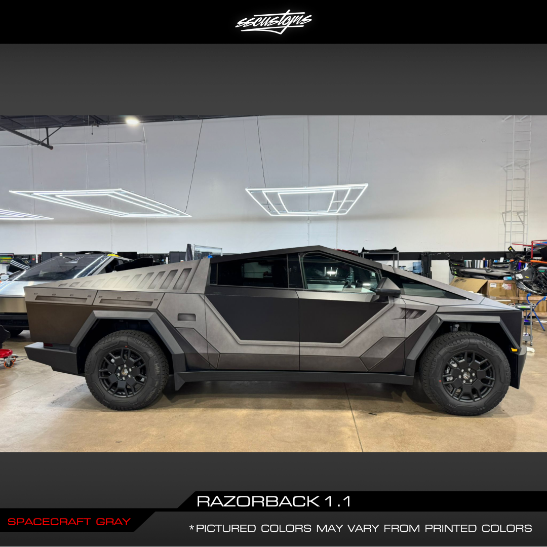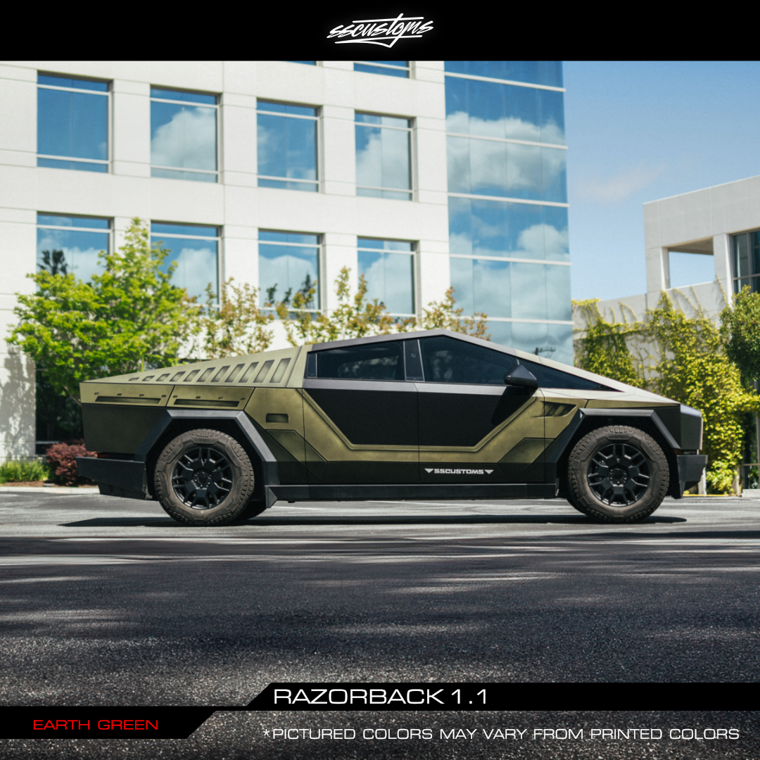 This is our own unique take on an off-world combat vehicle. This design took weeks to craft. The details showcase various vents and ports. Enhanced dimensional metal-esque panels with realistic fading. This is sure to be a show stopper. Couple this with Unplugged Performance Molle Racks and Roof Racks (Coming Soon to our CyberTruck Shop) for the perfect off-world combat look.